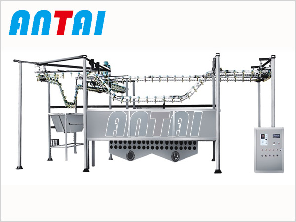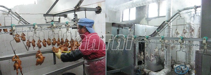 懸掛油炸雞線采用鏈條吊掛傳送系統(tǒng),有六個(gè)工作區(qū)分別有雞掛線區(qū)、上糖區(qū)、瀝糖區(qū)、油炸區(qū)、瀝油風(fēng)冷區(qū)、下線區(qū);懸掛方式有掛鉤是和炸框’式。