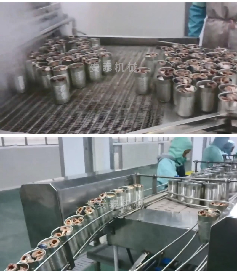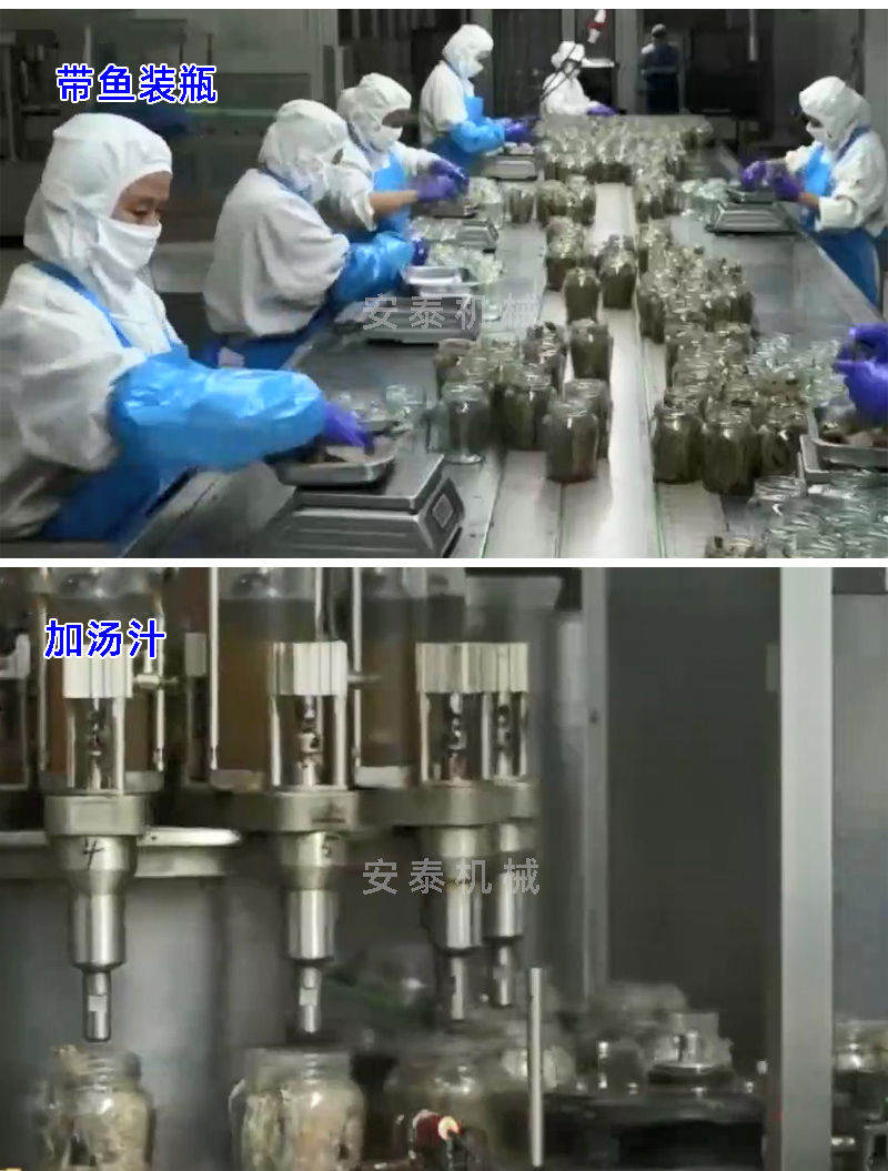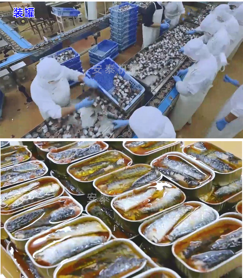 鲅魚罐頭生產工藝 解凍——切斷——清洗——裝罐——蒸煮——加湯汁——真空封罐——高溫殺菌——裝卸籠——實罐清洗——吹干——貼標——裝箱——碼垛 帶魚罐頭生產工藝 解凍——切斷——清洗——腌制——烘干——油炸————浸湯汁——裝罐(裝瓶)——真空封罐——高溫殺菌鍋——裝卸籠——實罐清洗——吹干——貼標——裝箱——碼垛